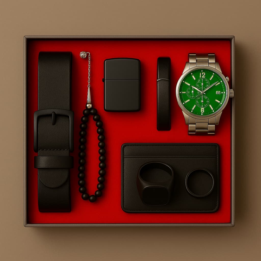 Deri Cüzdan - Tespih - Deri Kemer - Çakmak - Deri Bileklik - Kol Saati Hediye Seti